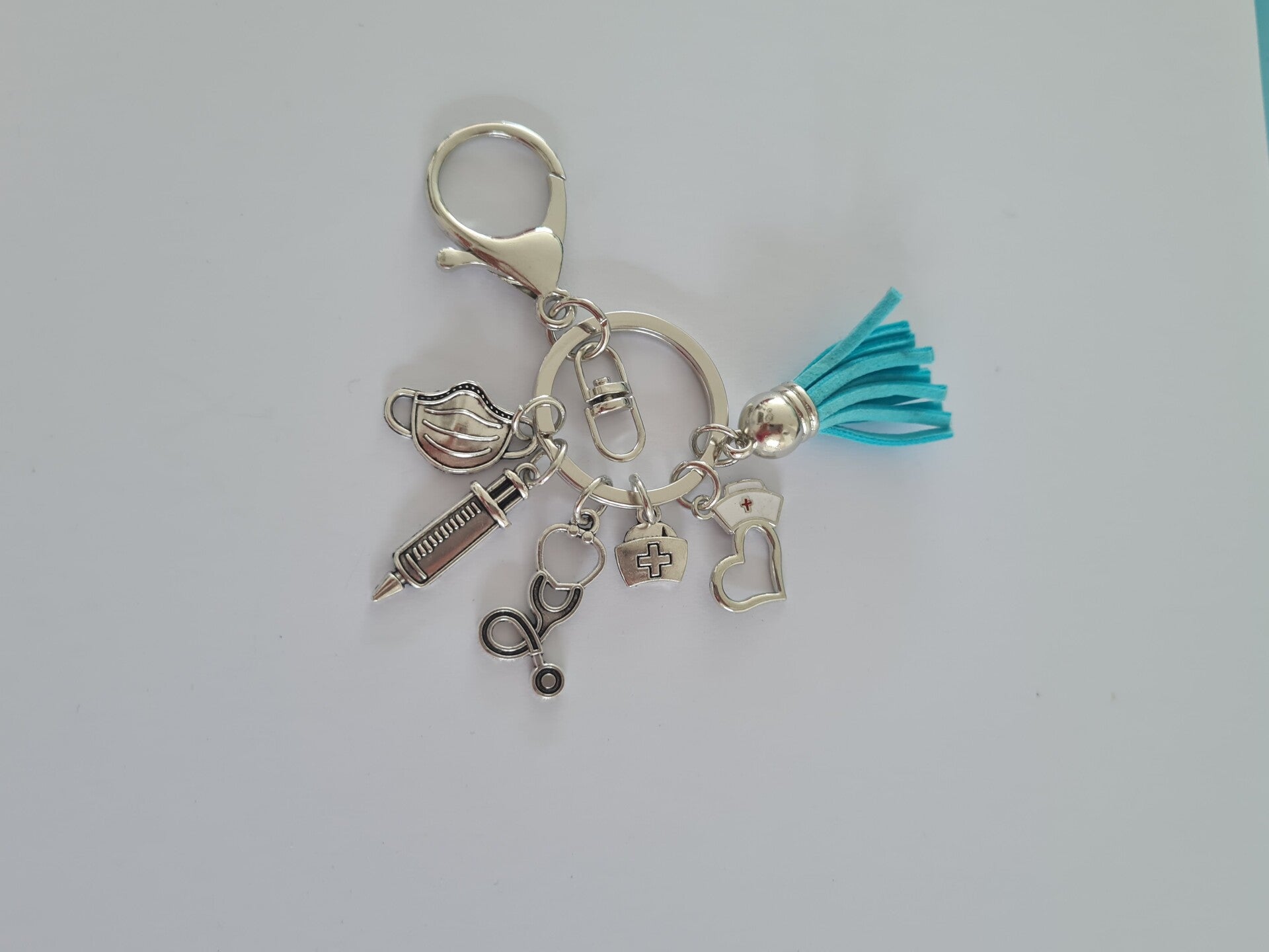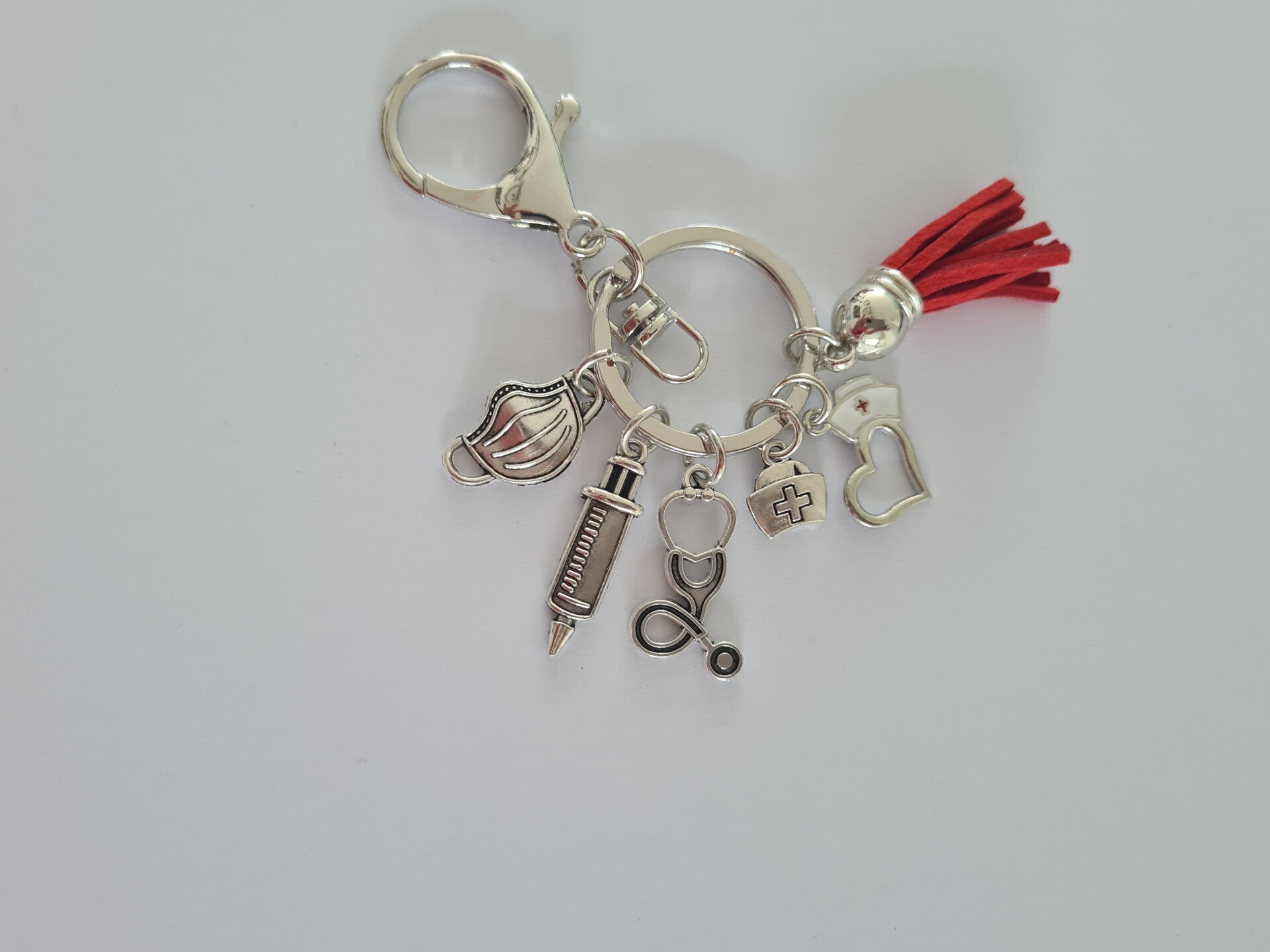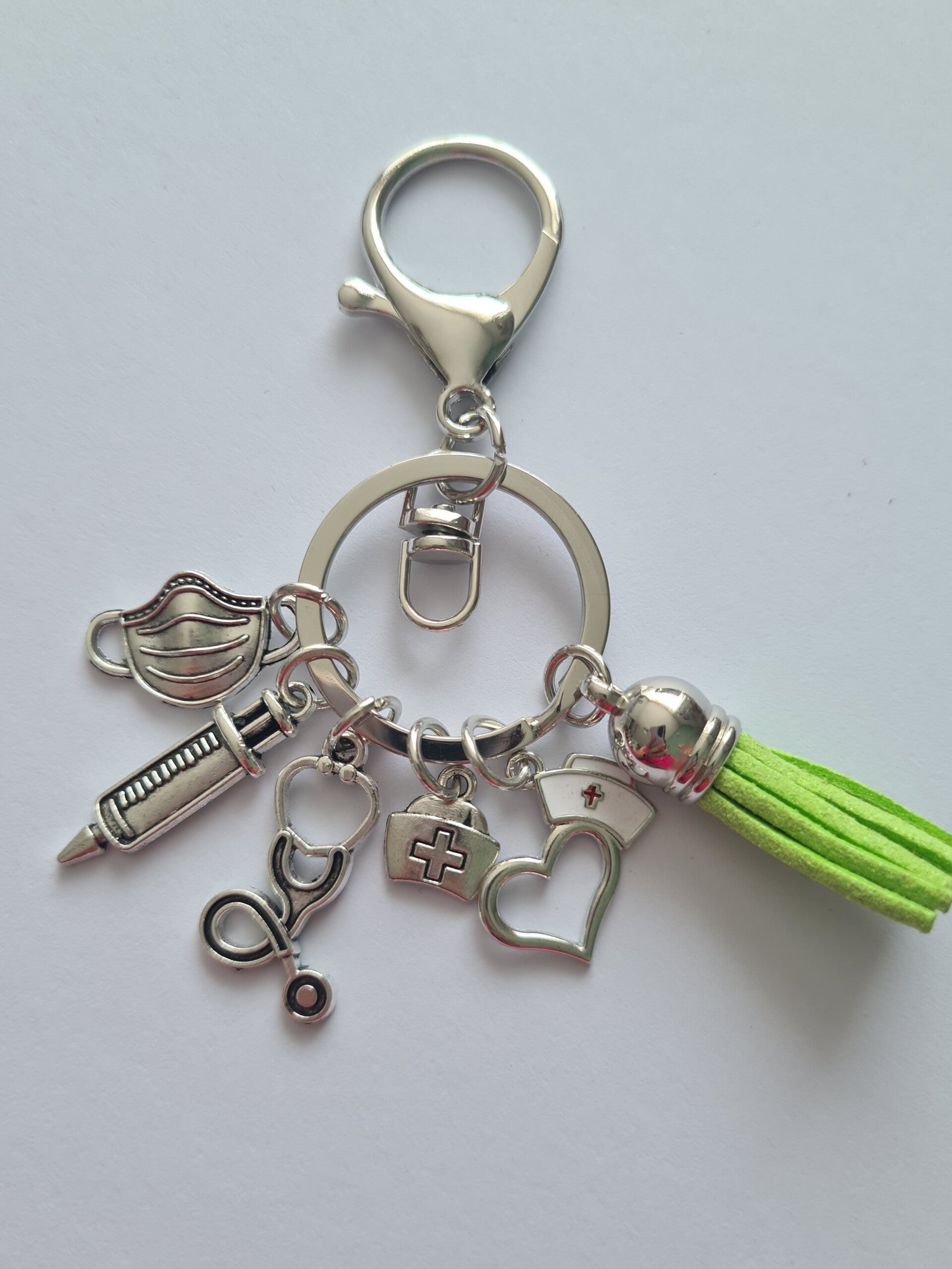 Deze sleutelhanger is een supercadeau voor iedereen die in de zorg werkt. Aan de sleutelring hangen 6 bedels. Een spuitje, een stethoscoop, een zusterkapje, monkapje, hartje, en een leuk gekleurd kwastje. Superleuk aan je sleutelbos of als tassenhanger.